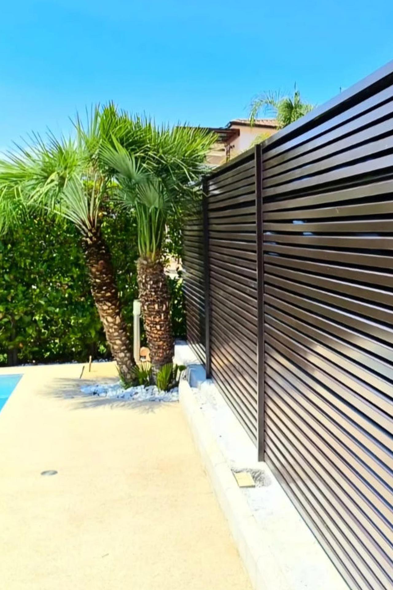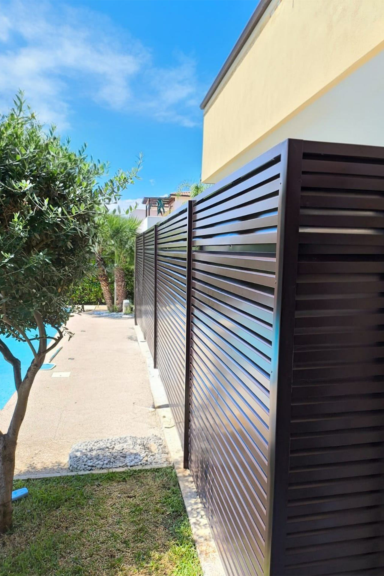 In un contesto residenziale abbiamo realizzato un separé in lamiera preverniciata testa di moro, pensato per garantire privacy visiva e armonia estetica. Una soluzione ideale per aree piscina, terrazzi o giardini, dove comfort e discrezione sono fondamentali.