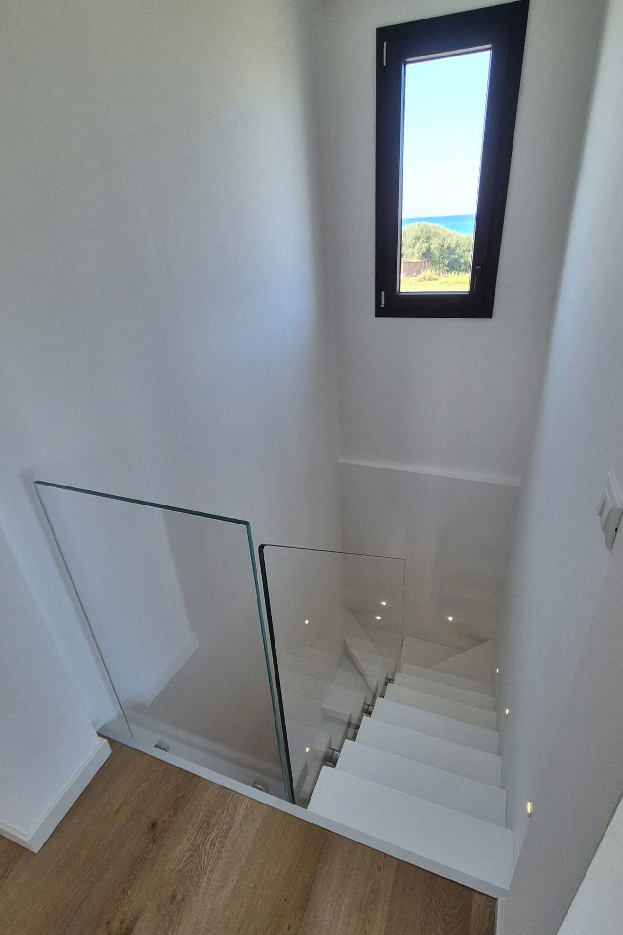A completare l'insieme, una ringhiera in vetro extrachiaro fissata a scomparsa. Il vetro non è un semplice accessorio, ma un componente che amplifica la luce naturale e mette in risalto il design minimalista dell'opera.