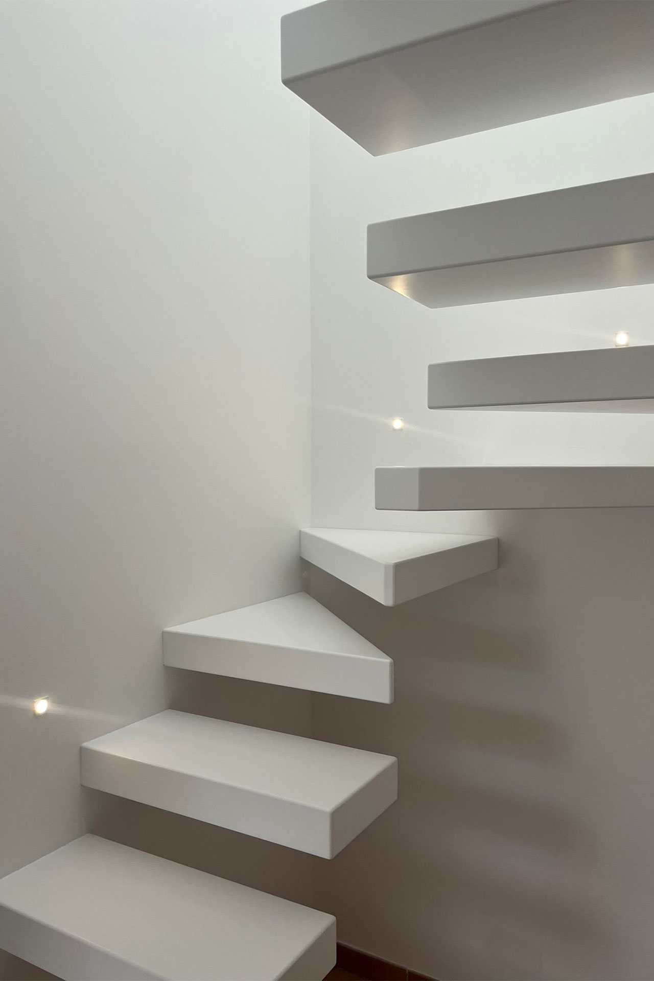Su ogni elemento strutturale è stata realizzata una pedata sospesa in ferro, successivamente rivestita con legno verniciato, trattato per resistere nel tempo e per valorizzare il contrasto tra materiali. Il risultato è, ancora una volta, una scala che sembra fluttuare.